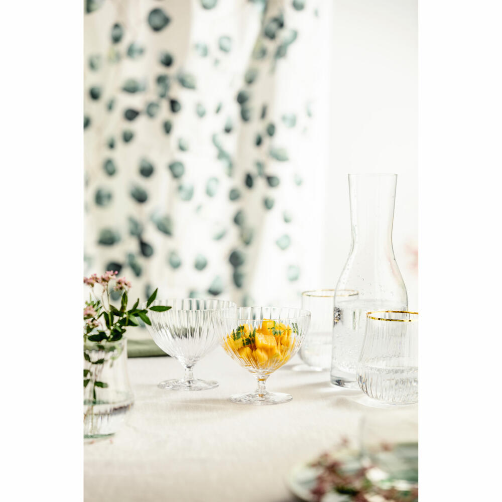 Stilvolle Schalen mit Fuß verleihen jedem Tablesetting das gewisse Extra. Glänzendes Edelmetall wird in den Veredelungswerkstätten der Glashütte Eisch sorgfältig aufgebracht und schafft zusammen mit der fein gerippten Struktur der Schale den perfekten Rahmen für Desserts, Cremes, Obstsalat, Gebäck oder Snacks.