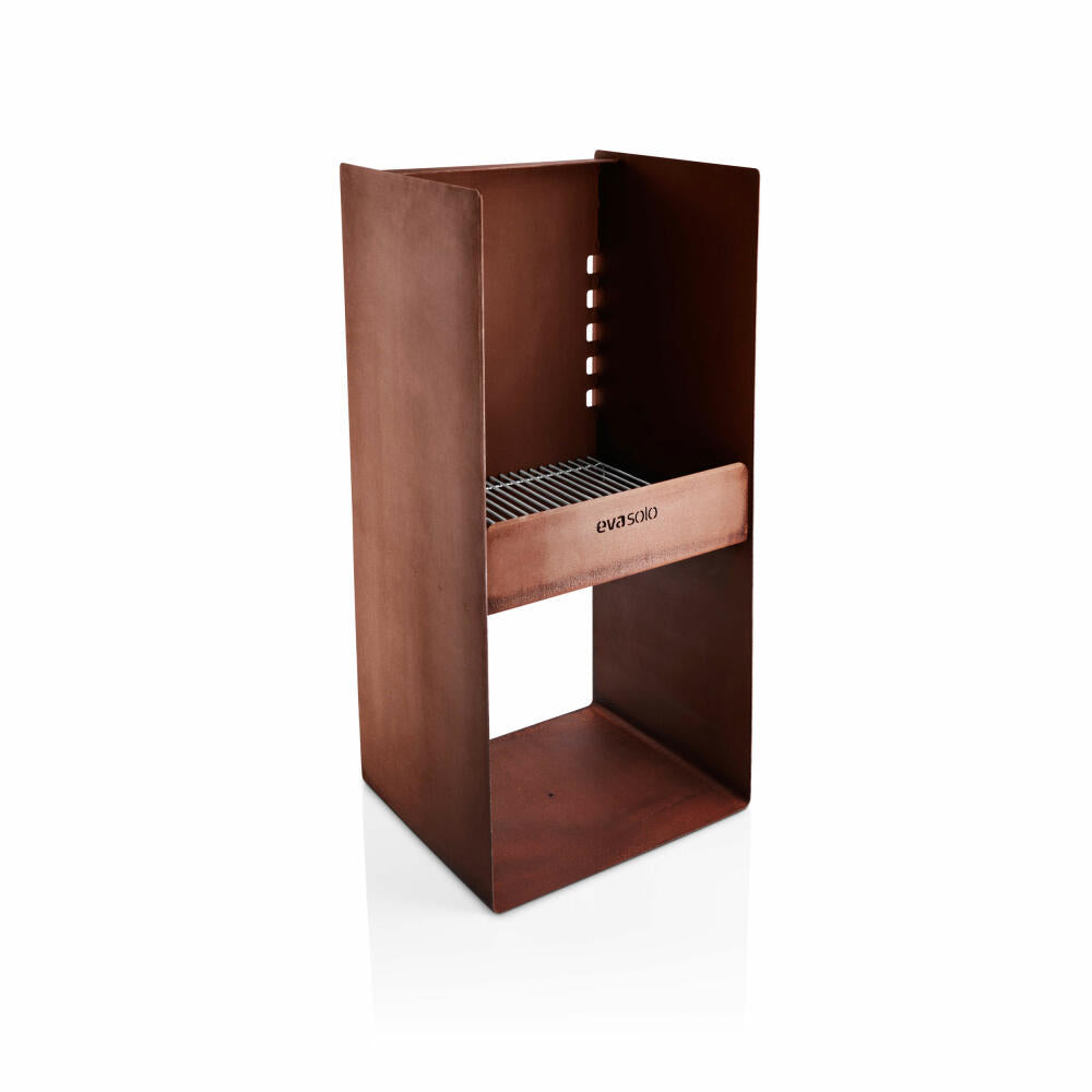 • High, sculptural grill made of Corten steel with integrated protection against strong wind