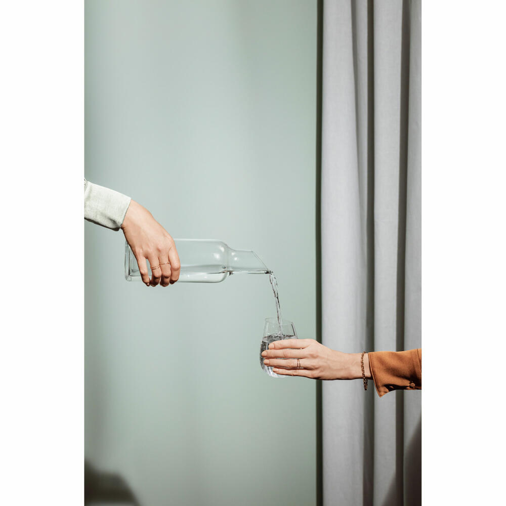 With this elegant glass carafe you can add a little Scandinavian flair to your dining table. In addition, the carafe fits perfectly in the fridge door and the water does not take on any foreign tastes in the fridge thanks to the practical oak wood stopper. The carafe is dishwasher safe and therefore easy to clean. The stopper, however, must be cleaned by hand. Because wood is a living, organic material, each stopper has its own individual grain and color. To maintain it, oil it regularly.