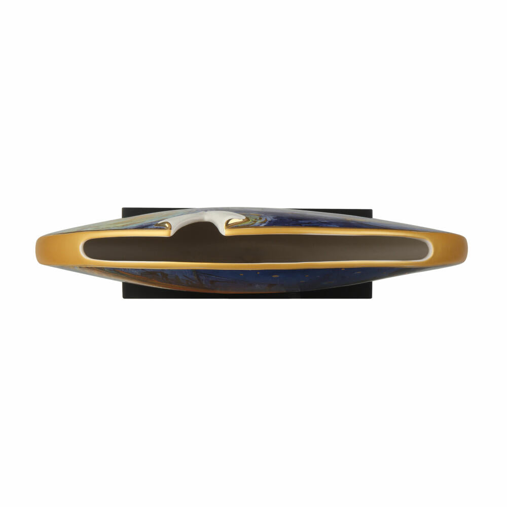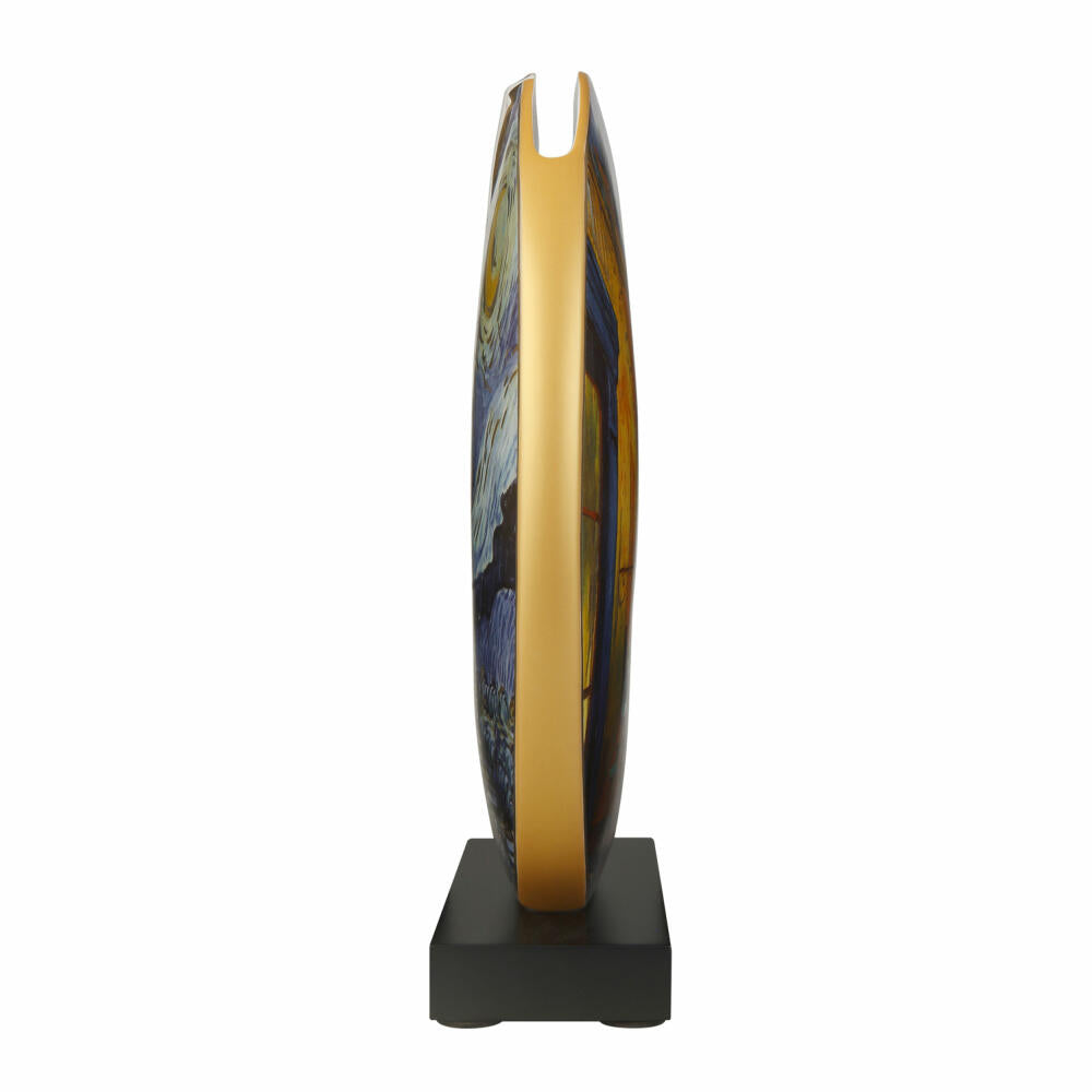 Wie frei schwebend wirkt die dekorative Diskusscheibe aus Porzellan auf dem massiven Holzsockel. Ein Designobjekt, das den berühmten Gemälden von Vincent Van Gogh einen würdigen Auftritt verschafft. Mit und ohne Blumenarrangement ist die Vase ein toller Blickfang für ein stilvolles Zuhause.