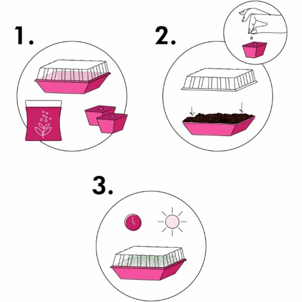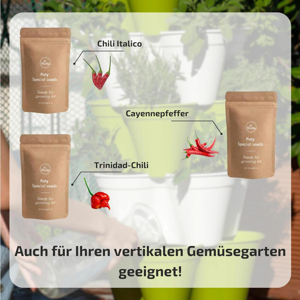 3 bags of seeds (Trinidad chili, Italian chili, cayenne pepper), germination propagator, coconut fiber brick