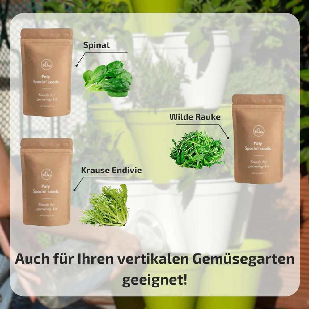 3 bags of seeds (spinach, curly endive, rocket), germination propagator, coconut fiber brick