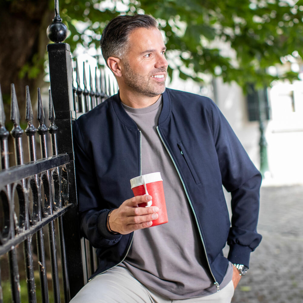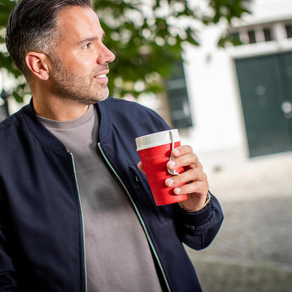 ISO TO GO impresses with its natural look and high functionality. The innovative material not only looks good, but is also made of bio-circular plastic and FSC-certified wood. The new material is of course food-safe and fully recyclable. The double-walled coffee cup keeps the coffee at a comfortable temperature for a long time, is pleasantly light and almost unbreakable. Thanks to flexible slats, the lid fits the cup like a glove and enables comfortable drinking. A special extra is the innovative lid closure. The tab reliably covers the drinking opening and air hole so that nothing can accidentally drip onto your clothes while you are on the go. Zero waste starts right here, because ISO TO GO is robust and easy to clean, can be refilled many, many times and saves a lot of unnecessary paper cups.