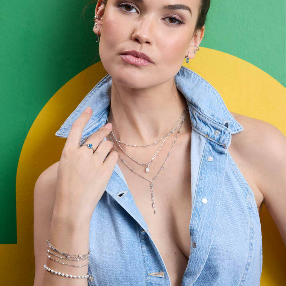 Hol dir das perfekte Gegenstück zu der eleganten Kette mit diesem wunderschönen Armband! Es besteht aus zwei zarten Ankerketten, die sanft gegeneinander versetzt sind und so einen besonderen, dynamischen Effekt erzeugen. In regelmäßigen Abständen setzen sich kleine, runde Metallstäbchen und funkelnde Glassteine in schmaler Fassung ab, die dem Armband einen modernen Charme verleihen. Dieses Armband passt perfekt zu jedem Outfit - sei es im Alltag oder zu besonderen Anlässen.