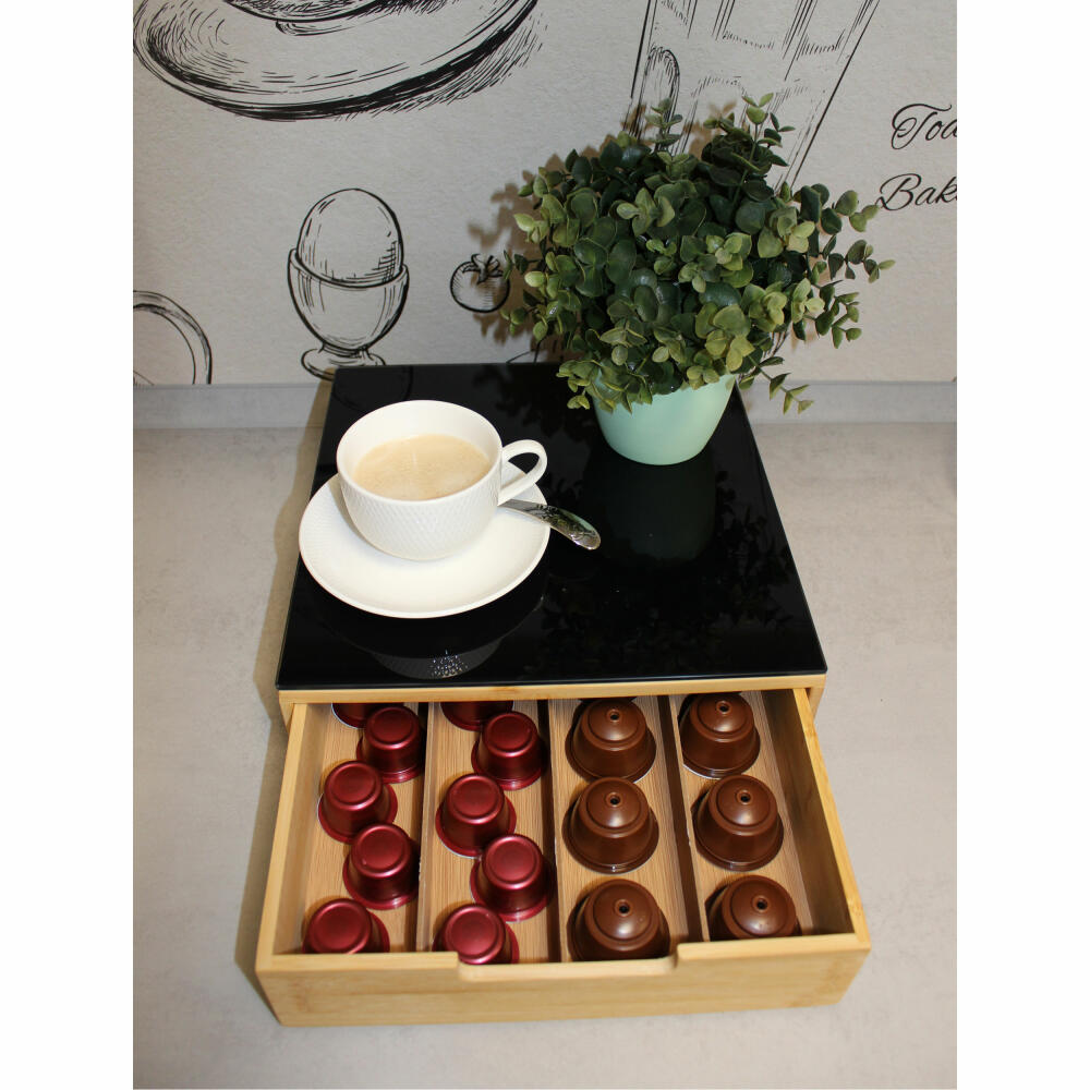 Der Bambus-Kapselständer mit geräumiger Schublade ist eine elegante Aufbewahrungslösung für Ihre Kaffeekapseln. Die Trenner lassen sich verschieben, sodass Platz für bis zu 56 Nespresso-Kapseln oder 20 Dolce Gusto Kapseln ist.