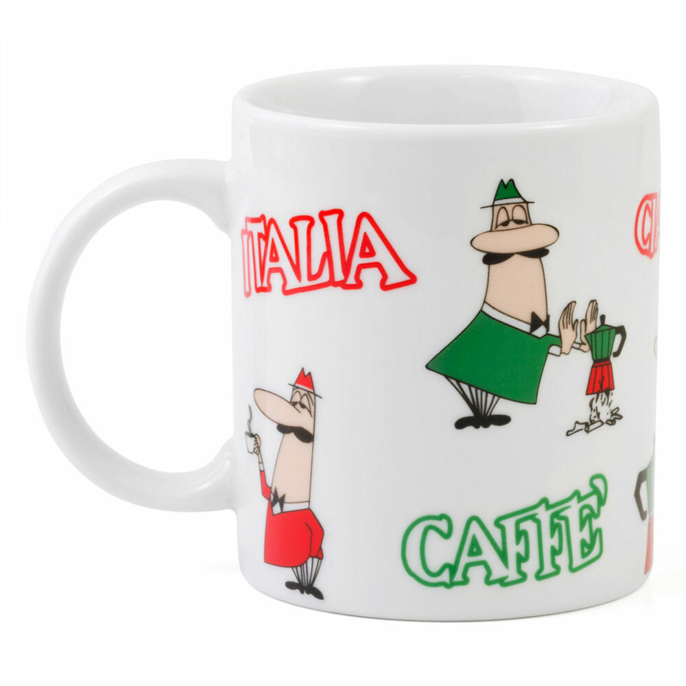 Kaffeebecher 315 ml aus hochwertigem Porzellan bedruckt mit dem Bialetti-Männchen in verschiedenen Szenen. Eine Ode an das italienische Lebensgefühl und eine besondere Freude beim allmorgendlichen Kaffee.