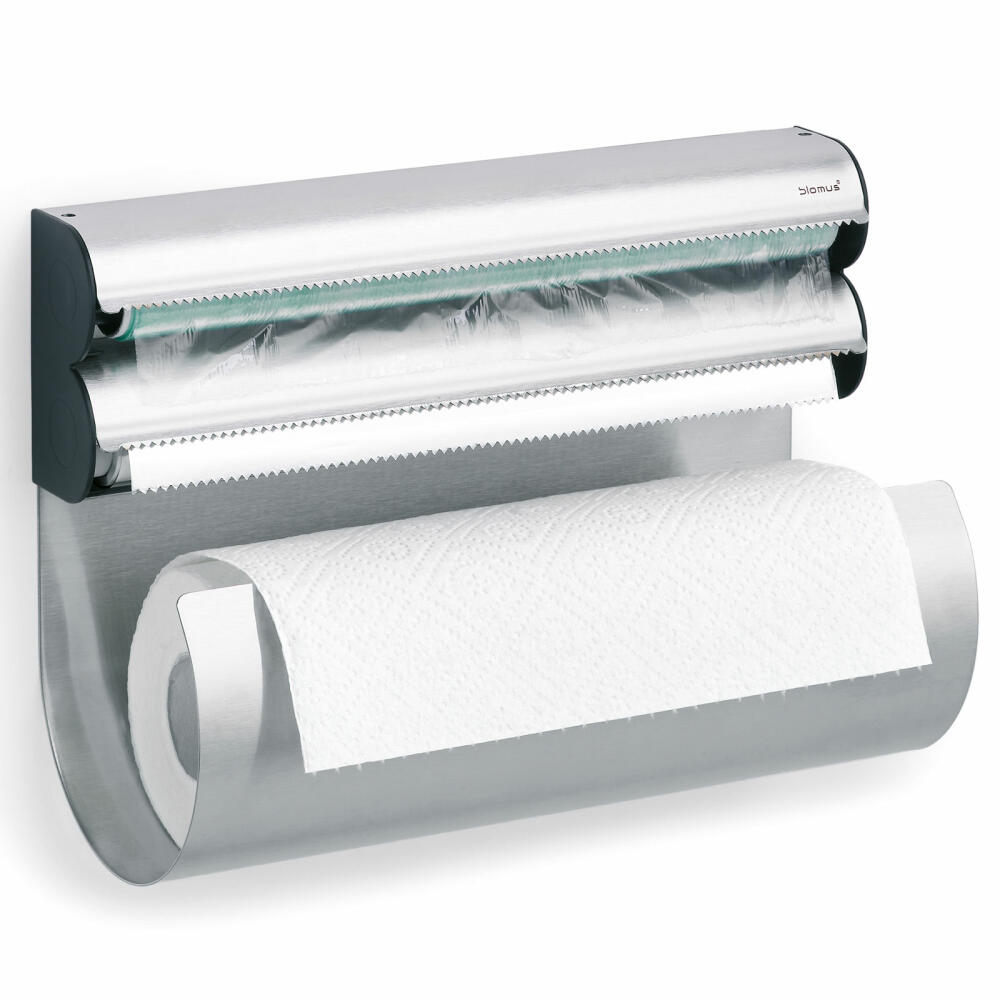 Der Küchenrollenhalter ist ein Multitalent. Frischhaltefolie, Alufolie und Küchenrolle werden aufbewahrt und zum Abriss bereitgehalten.