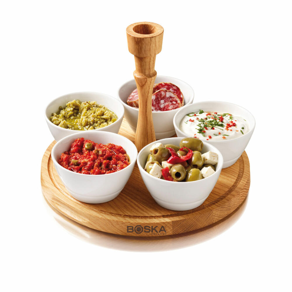 Dieses geschmackvolle Tablett mit Schälchen wurde speziell für die ultimative Snackfreude entworfen. Der stimmungsvolle Chip & Dip Halter ist einer der Prunkstücke aus dem Sortiment von Boska. Das Käsebrett enthält 5 Schälchen, worin Sie allerlei Sorten Tapas servieren können. Auch sind die Schälchen perfekt, um Soßen zu servieren. Als echter Fan von Häppchen und Tapas, darf dieses Käsebrett mit seinen Schälchen nicht in Ihrem Haus fehlen. Der Chip & Dip Halter besteht aus eurpäischer weißer Eiche. Beigefügt sind 5 Porzellanschälchen, in denen Tapas serviert werden können.