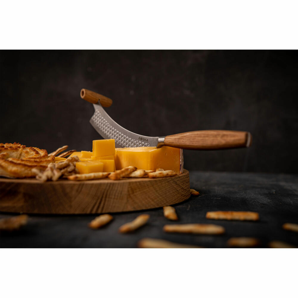 Schneiden Sie halbharte und harte Käsesorten wie ein echter Käseprofi mit dem holländischen Käsemesser Oslo+. Das Messer mit der gebogenen Klinge aus Edelstahl gleitet in einer Art Wiegebewegung durch die Käserinde. Der Griff aus Eichenholz liegt gut in der Hand.