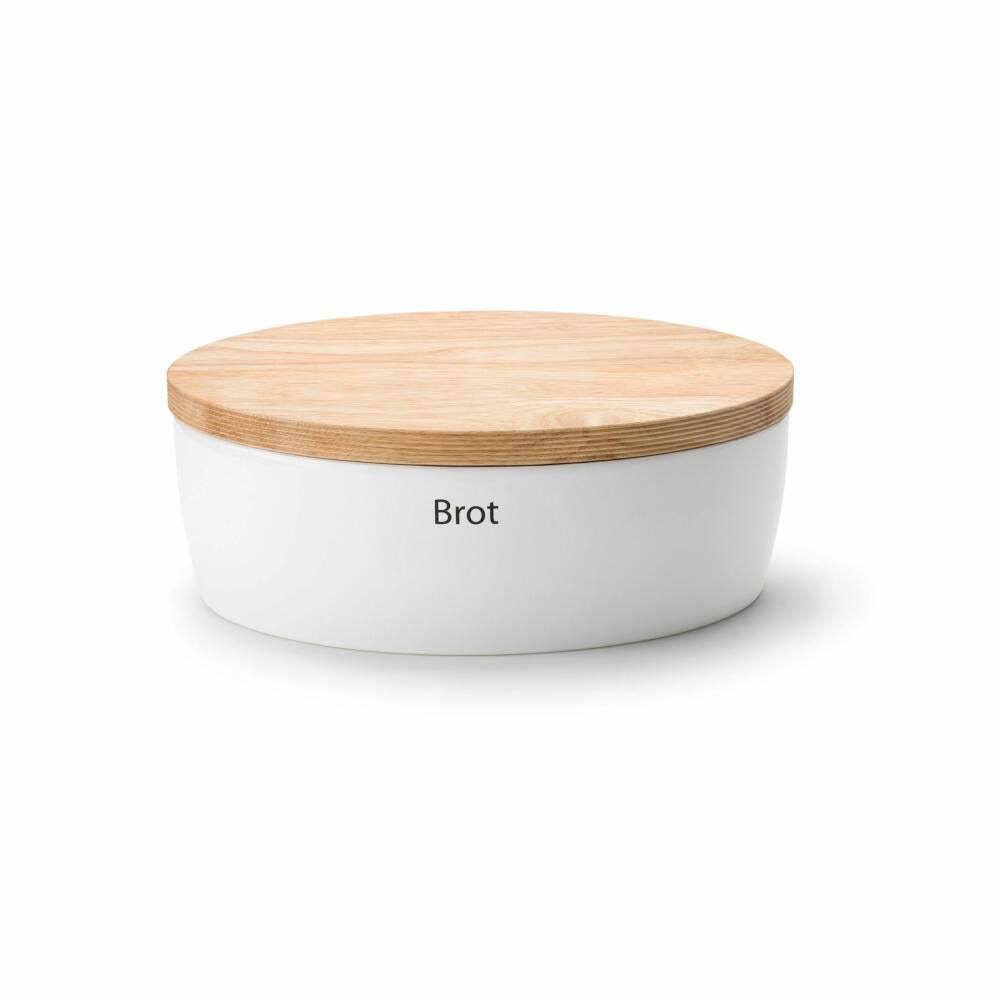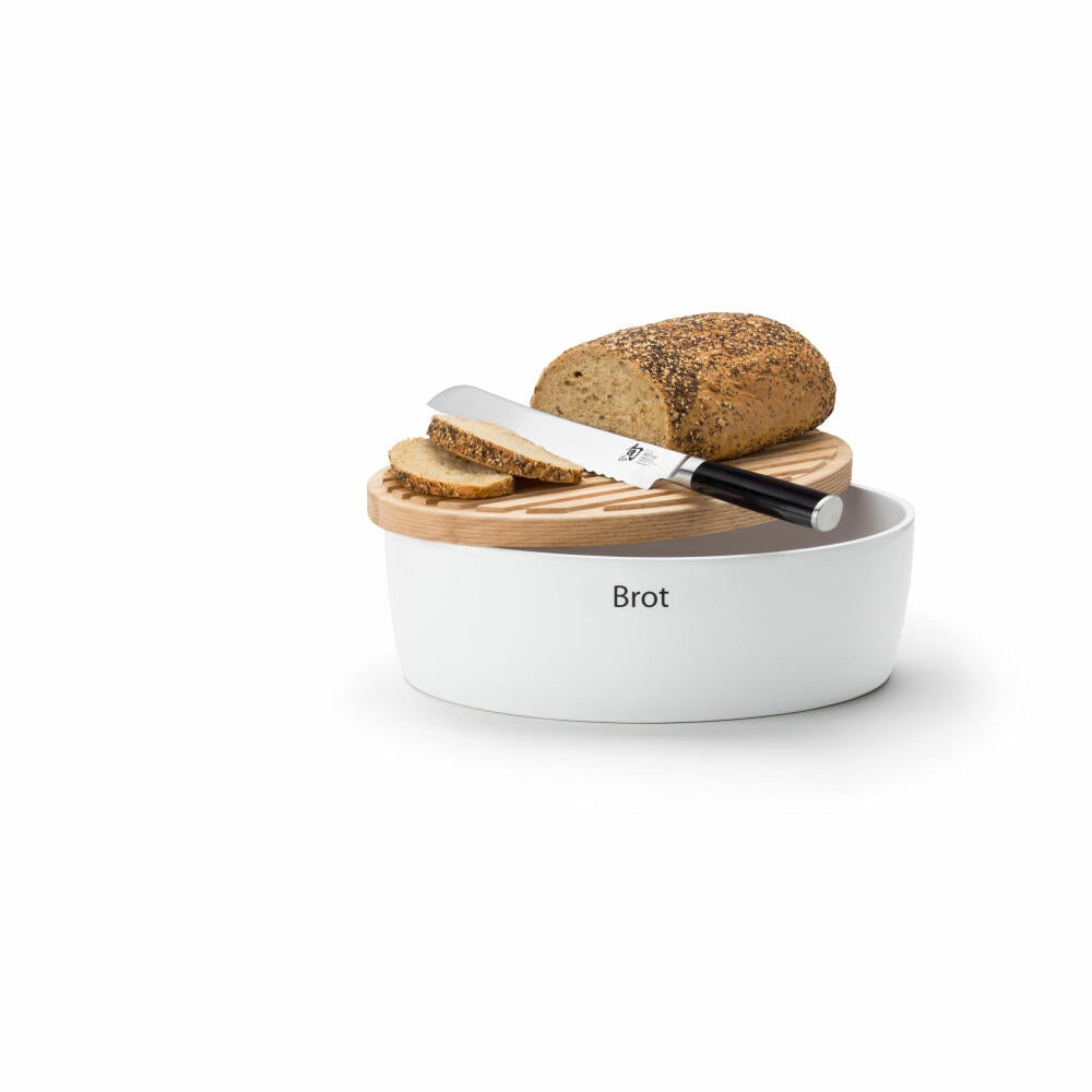 Der praktische Brottopf aus weißer Keramik passt mit seinem helle Holzdeckel in jede Küche. Das Brot bleibt frisch durch gute Belüftung. Die Rückseite des Deckel kann gleichzeitig als Brotschneidebrett genutzt werden - damit hat man zwei Artikel in einem.