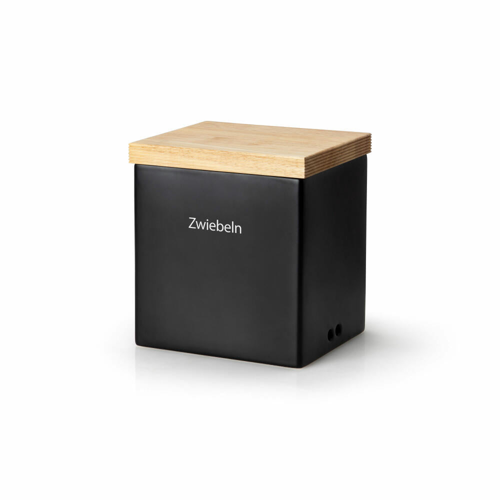 Die praktische Vorratsdose aus schwarzer Keramik passt mit dem hellen Holzdeckel in jede Küche. Lebensmittel werden darin durch spezielle Luftlöcher gut belüftet. Die Änderung der Beschriftung ist kein Problem - innen liegen Etiketten mit alternativen Beschriftungen.