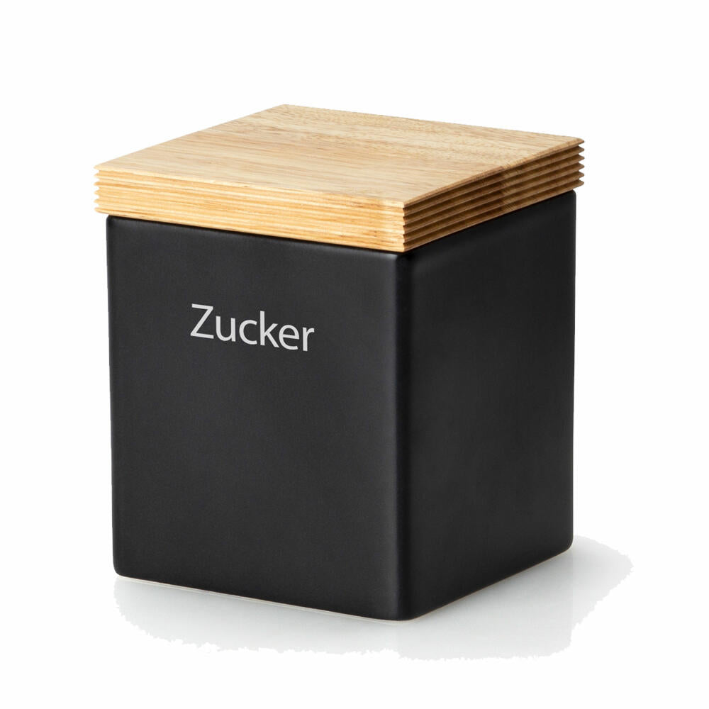 Die praktische Vorratsdose aus schwarzer Keramik passt mit dem hellen Holzdeckel in jede Küche. Damit alles gut verschlossen bleibt, ist im Deckel ein Siliconring integriert. Die Änderung der Beschriftung ist kein Problem - innen liegen Etiketten mit alternativen Beschriftungen.
