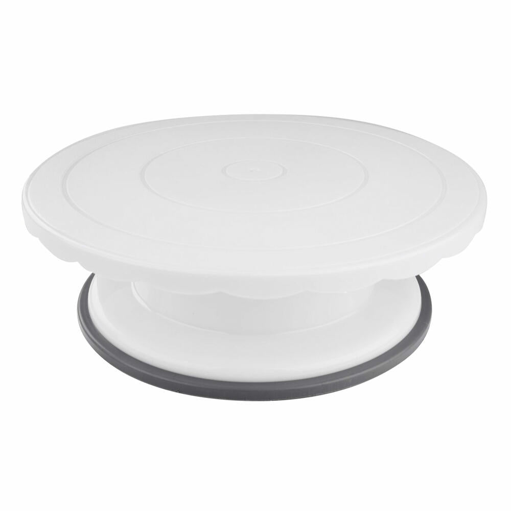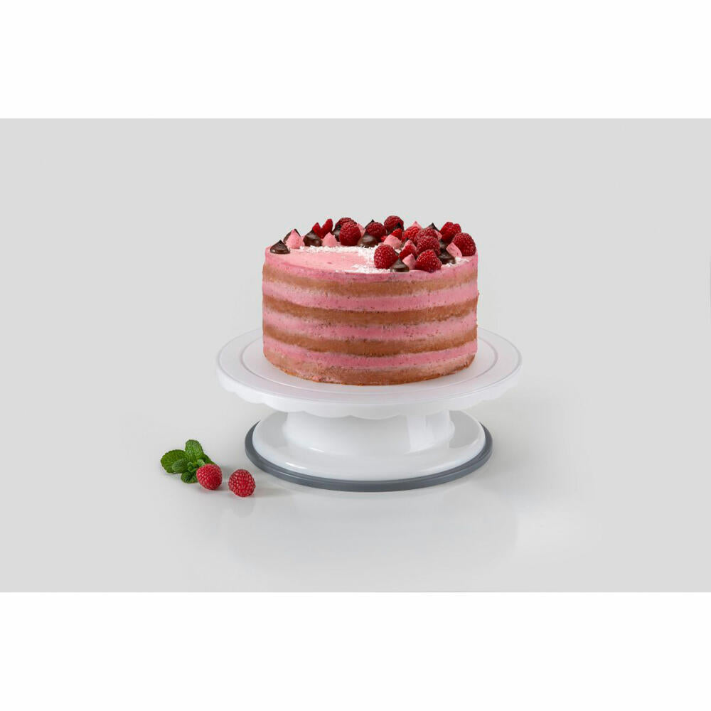 Mit der drehbaren Tortenplatte aus hochwertigem Kunststoff kann der Schichtkuchen ganz einfach im Ganzen eingestrichen und verziert werden. Der ausgeklügelte Mechanismus ermöglicht eine präzise und leichte Drehbewegung, gleichzeitig steht die Tortenplatte dank des Anti-Rutsch Bodens fest auf der Arbeitsoberfläche auf. Mit einem Durchmesser von circa 27,5 cm können kleine wie große Torten und Kuchen auf der Platte verziert werden. Sie eignet sich ebenso zum Anrichten und Präsentieren der Köstlichkeiten auf der Festtafel.