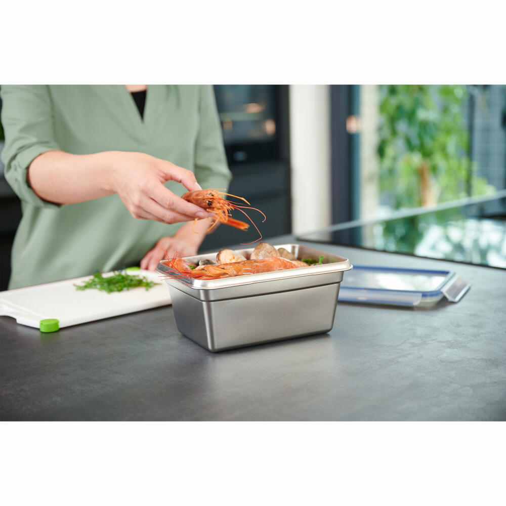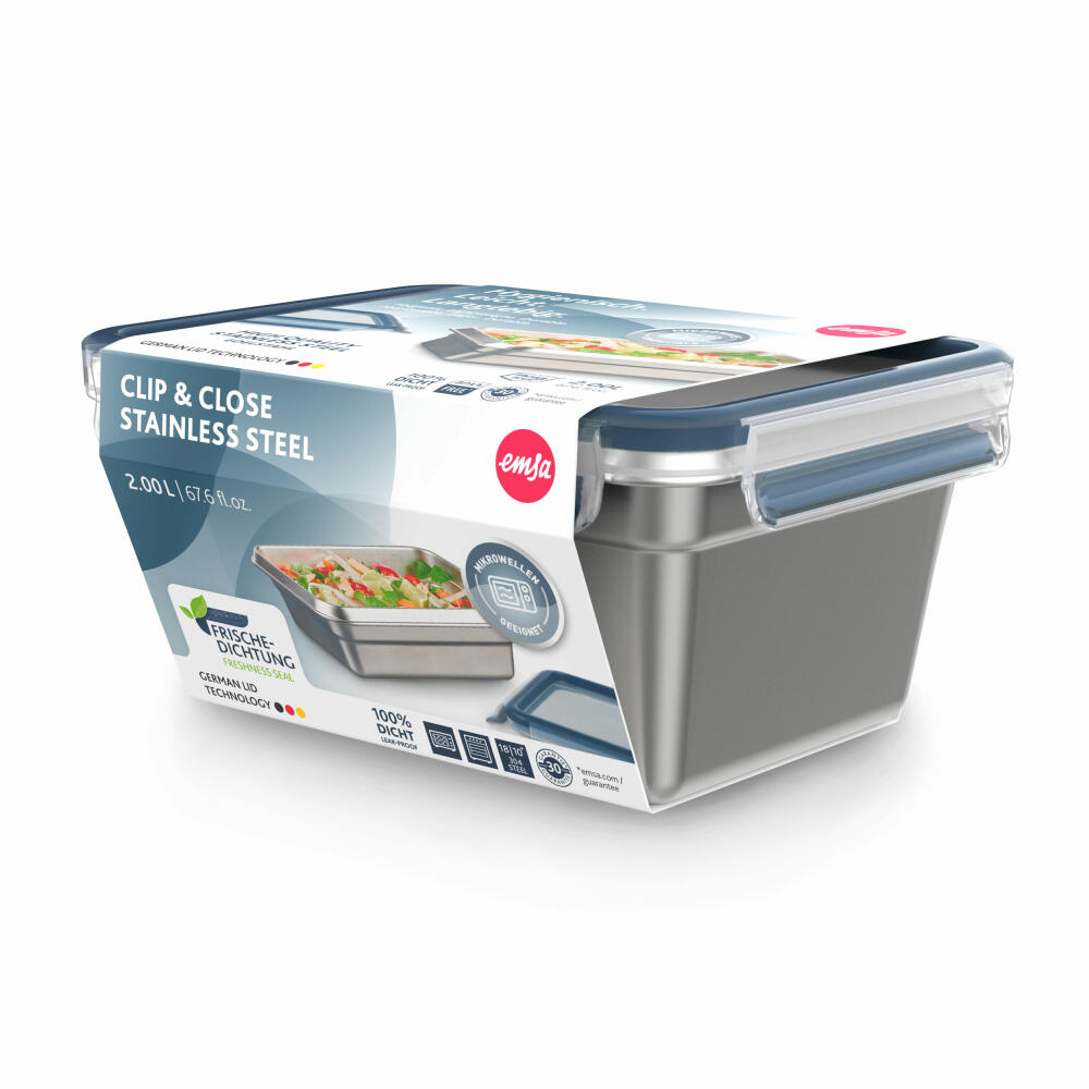 Erstklassiger Edelstahl für unvergleichliche Vielseitigkeit und Qualität: Die EMSA CLIP & CLOSE Edelstahl Frischhaltedose ist eine clevere Lösung für einen gesunden, modernen Lebensstil, sorgt für mühelose Aufbewahrung und vieles mehr. Dieser vielseitige Behälter ist aus leichtem, haltbarem, geschmacksneutralem und sehr robustem Edelstahl hergestellt, um langanhaltende Frische zu sichern und den vollen Geschmack von Zutaten und Resten zu erhalten. Das clevere Design bietet volle Vielseitigkeit: 100 % dicht für Aufbewahrung und Transport ohne Auslaufen, 100 % frostfest für Verwendung im Gefrierfach oder in der Kühltruhe, 100 % spülmaschinenfest für einfache Reinigung und 100 % hygienisch mit einem völlig dichten Deckel und einer Dichtung, die den Behälter fest verschließen. Die backofenfeste Basis kann als Backform für köstliche Gratins, gegrilltes Gemüse und vieles mehr verwendet werden. Das i-Tüpfelchen bildet die deutsche Ingenieursarbeit für ein cleveres Clipdeckelsystem, mit dem die Aufbewahrung zum Kinderspiel wird.