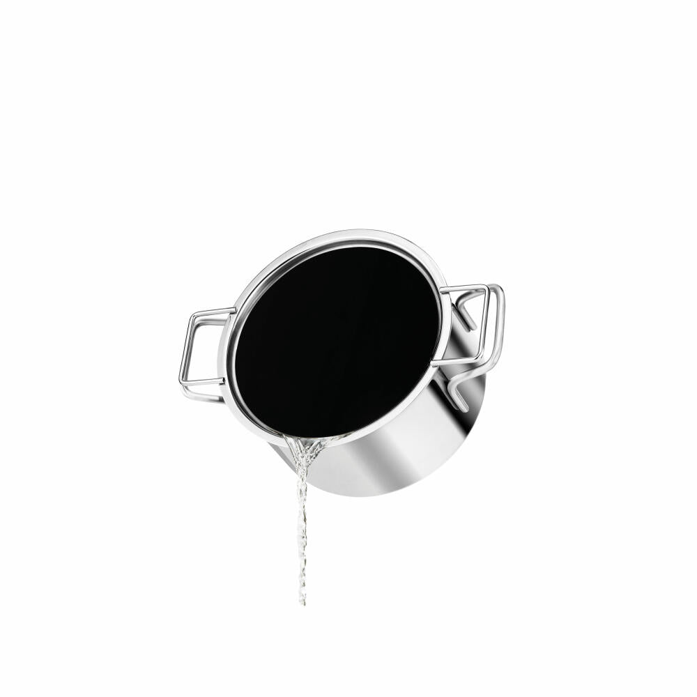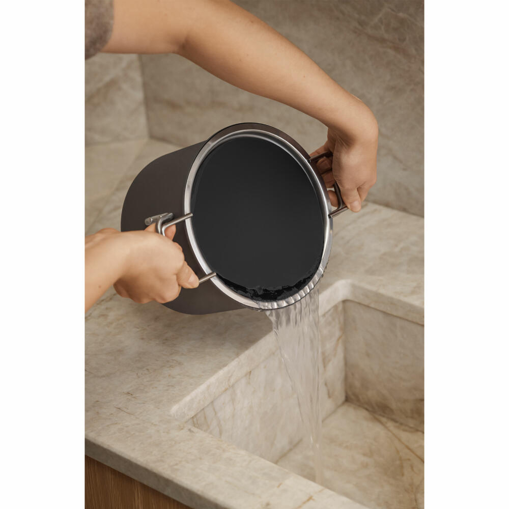 Der Abgießdeckel hat ein integriertes Sieb zum Abgießen von Flüssigkeiten. Das Sieb ist von einer Silikonscheibe bedeckt, die die Wärme und Feuchtigkeit im Topf hält. Beim Abgießen löst sich die Silikonscheibe automatisch etwas vom Deckel, sodass das Wasser ablaufen kann. Der Deckel kann gestapelt oder an einen Haken gehängt werden. Dank des flachen Designs können während des Kochens auf dem Deckel Teller oder Schüsseln abgestellt werden, um diese warmzuhalten. Der Stahlteil des Deckels besteht aus 90 Prozent Post-Consumer-Recycling-Stahl. Alle Töpfe, Pfannen und Deckel von Eva Trio haben feste Größen, d. h. sie können modell- und materialübergreifend gestapelt und miteinander kombiniert werden. Dadurch können Sie immer genau den Deckel wählen, den Sie gerade brauchen, ohne dabei allzu viele Deckel vorhalten zu müssen. Die Eva Trio Deckel können einzeln erworben werden und sind ofen- und spülmaschinenfest.