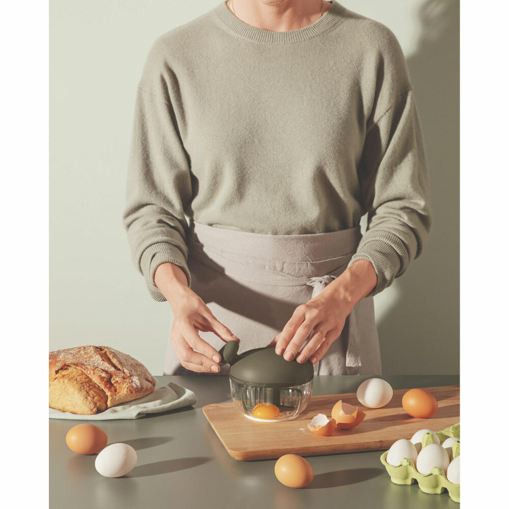 Hacken, Pürieren und Aufschlagen - ganz ohne Strom! Dank des praktischen Seilzugs am Mini-Zerkleinerer lässt sich Gemüse einfach, schnell und effizient zerkleinern oder auch Sahne steif schlagen. Einfach die Zutaten in den Behälter geben, den Deckel aufsetzen und an der Schnur ziehen. Weil der Mini-Zerkleinerer manuell betrieben wird, kann das Hacken oder Aufschlagen gut kontrolliert werden. Je öfter man an der Schnur zieht, desto feiner wird das Ergebnis. Der Mini-Zerkleinerer wird inklusive eines zusätzlichen Mix-Einsatzes geliefert, in dem sich Sahne, Milch oder Eiweiß aufschlagen lässt. Behälter und Einsätze sind spülmaschinenfest, der Deckel muss jedoch mit heißem Wasser und Spülmittel gereinigt werden.