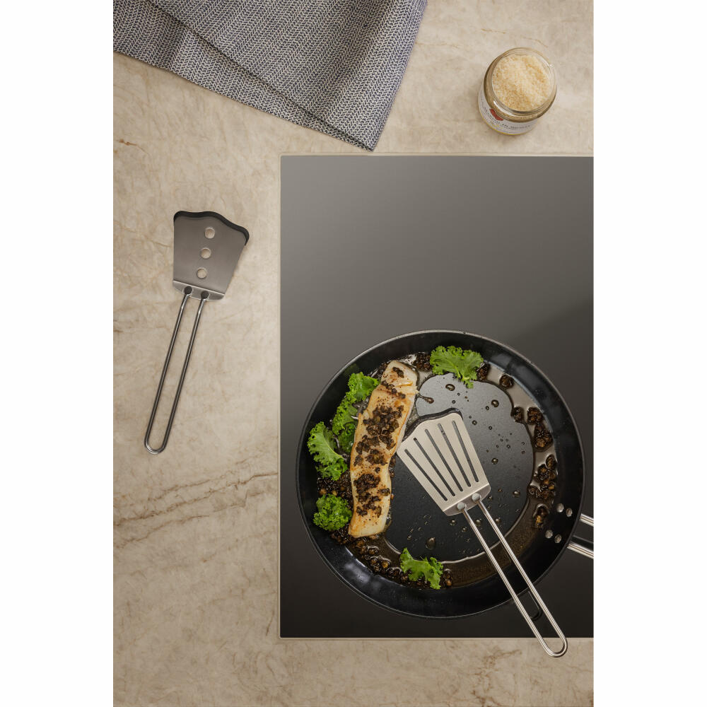 Der Pfannenwender ist ein unentbehrlicher Küchenhelfer - ideal zum Wenden, Rühren, Anheben und Anrichten. Dank des flachen Endes mit abgewinkelten Kanten gleitet er mühelos unter flache Speisen wie Pfannkuchen, Spiegeleier und Fischfilets. Das Silikonende des Pfannenwenders verhindert, dass die Oberflächen von Töpfen und Pfannen zerkratzt und beschädigt werden. Der Pfannenwender besteht aus Edelstahl, hält hohen Temperaturen stand und ist praktisch unkaputtbar. Der Pfannenwender ist spülmaschinengeeignet.