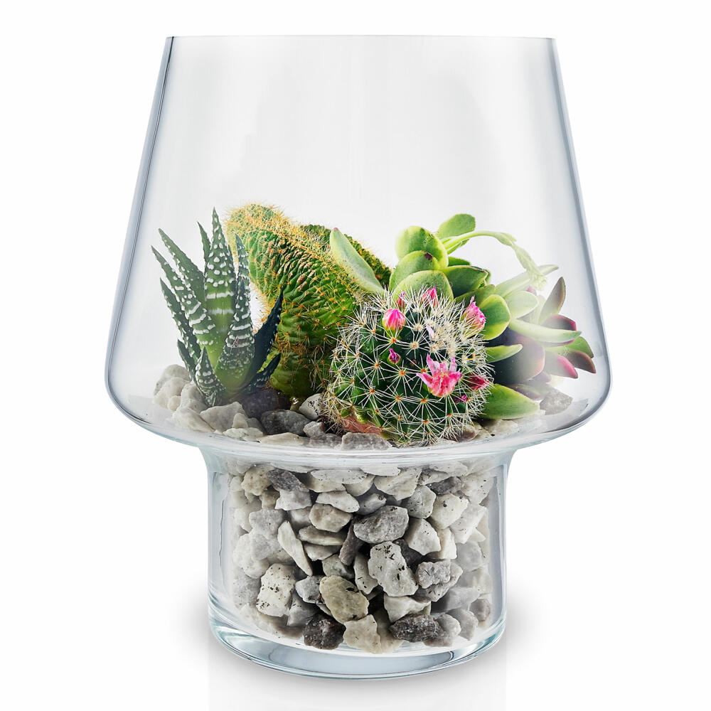 Diese skulpturale Glasvase ist ein dekoratives Pflanzgefäß für Sukkulenten. Legen Sie ein eigenes Pflanzenterrarium an, und schenken Sie Ihren Sukkulenten in der Glasvase optimale Wachstumsbedingungen. Sukkulenten sind pflegeleicht - sie brauchen nur Licht und Wasser - und kommen in vielen verschiedenen Formen daher. Dank der Glasvase ist leicht zu erkennen, ob die Pflanze gewässert werden muss. Sie ist auch als Vase für Schnittblumen geeignet.