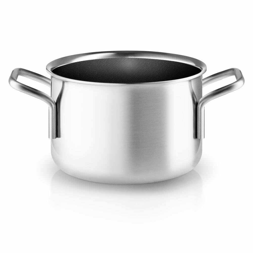 Dieser Topf vereint die klassische Formensprache und bekannte Qualität von Eva Trio mit den neuesten Verbesserungen und Materialien. Das einzigartige Muster auf der Innenseite besteht oben aus Edelstahl und am Boden aus einer keramischen Slip-Let-Antihaftbeschichtung. Diese Kombination verringert das Risiko, dass Speisen anhaften oder anbrennen, und die Beschichtung ist so strapazierfähig, dass Sie beim Kochen bedenkenlos Metallutensilien verwenden können. Der Topfkörper besteht aus einer Kombination aus 85-90 Prozent Post-Consumer-Recycling-Edelstahl und 100 Prozent Post-Consumer-Recycling-Aluminium. Die einzigartige dreischichtige Multi-Layer-Technologie sorgt für eine schnelle Erwärmung, eine gleichmäßige Wärmeverteilung und eine strapazierfähige Außenseite, die Verschleiß und täglichem Gebrauch standhält. Der Topf ist ofenfest bis 400 °C und für alle Wärmequellen (einschl. Induktion) geeignet. Er lässt sich mühelos in der Spülmaschine oder mit Stahlwolle reinigen. Das Design basiert auf dem klassischen Ole Palsby/Eva Trio-Design von 1977, d. h. der Topf bietet weiterhin die bekannten und geschätzten Eva Trio-Eigenschaften wie kalte Griffe, Gießrand, Stapelbarkeit und Kompatibilität mit Deckeln und anderen Teilen der Eva Trio-Serie.