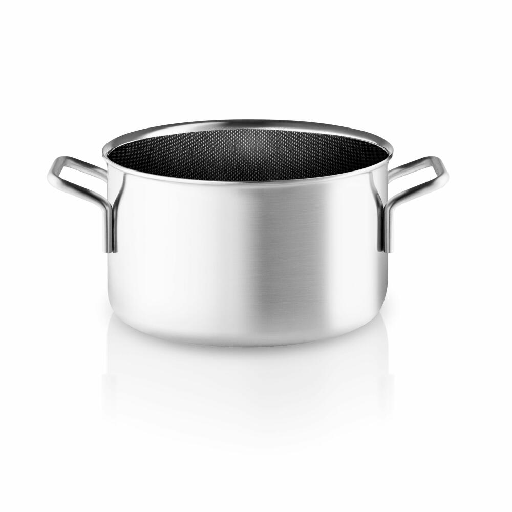 Dieser Topf vereint die klassische Formensprache und bekannte Qualität von Eva Trio mit den neuesten Verbesserungen und Materialien. Das einzigartige Muster auf der Innenseite besteht oben aus Edelstahl und am Boden aus einer keramischen Slip-Let-Antihaftbeschichtung. Diese Kombination verringert das Risiko, dass Speisen anhaften oder anbrennen, und die Beschichtung ist so strapazierfähig, dass Sie beim Kochen bedenkenlos Metallutensilien verwenden können. Der Topfkörper besteht aus einer Kombination aus 85-90 Prozent Post-Consumer-Recycling-Edelstahl und 100 Prozent Post-Consumer-Recycling-Aluminium. Die einzigartige dreischichtige Multi-Layer-Technologie sorgt für eine schnelle Erwärmung, eine gleichmäßige Wärmeverteilung und eine strapazierfähige Außenseite, die Verschleiß und täglichem Gebrauch standhält. Der Topf ist ofenfest bis 400 °C und für alle Wärmequellen (einschl. Induktion) geeignet. Er lässt sich mühelos in der Spülmaschine oder mit Stahlwolle reinigen. Das Design basiert auf dem klassischen Ole Palsby/Eva Trio-Design von 1977, d. h. der Topf bietet weiterhin die bekannten und geschätzten Eva Trio-Eigenschaften wie kalte Griffe, Gießrand, Stapelbarkeit und Kompatibilität mit Deckeln und anderen Teilen der Eva Trio-Serie.