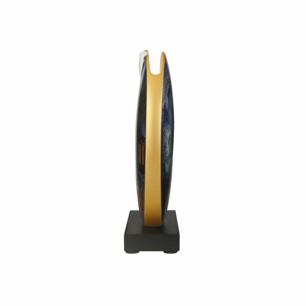 Wie frei schwebend wirkt die dekorative Diskusscheibe aus Porzellan auf dem massiven Holzsockel. Ein Designobjekt, das den berühmten Gemälden von Vincent Van Gogh einen würdigen Auftritt verschafft. Mit und ohne Blumenarrangement ist die Vase ein toller Blickfang für ein stilvolles Zuhause.