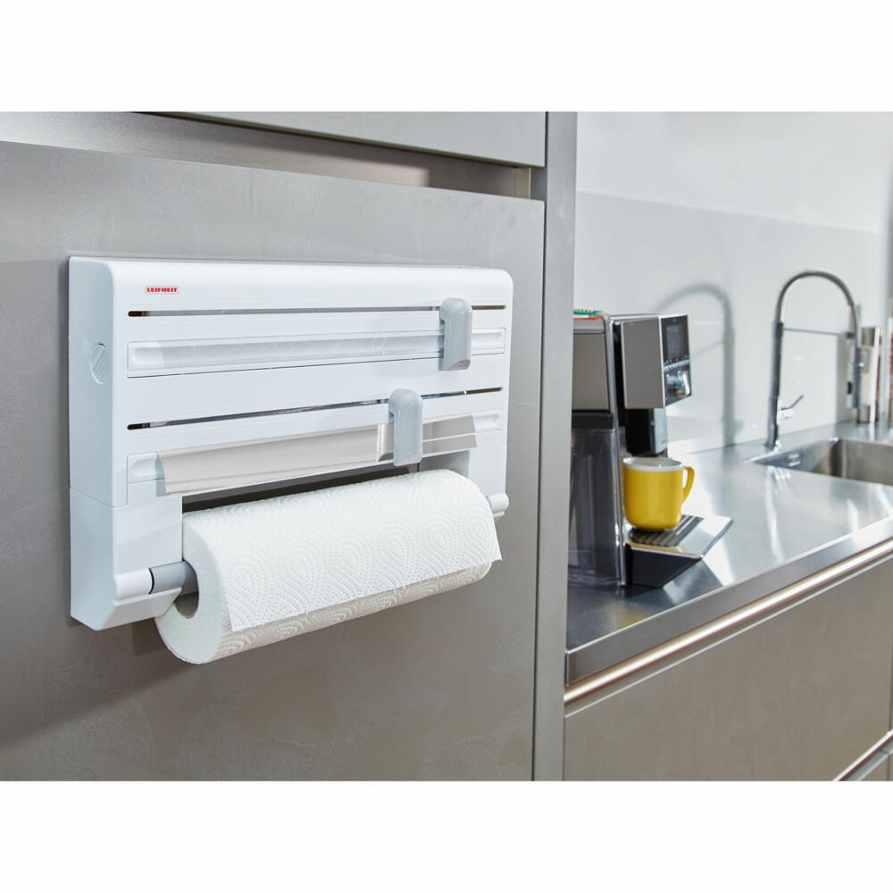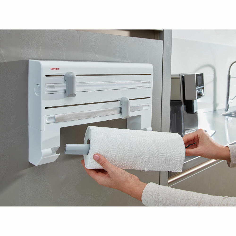 Ziehen, schneiden, fertig - der Wandrollenhalter Parat trennt mit seinen messerscharfen Spezialklingen Alu- und Klarsichtfolien sauber und präzise ab. Ohne zeitraubendes Kramen in Schubladen, ohne schiefe, zerrupfte Abrisskante und ohne Gefummel an der Klarsichtfolie, weil der Anfang nicht zu finden ist. Nach dem Schneiden ragen die Folien-Enden weit genug aus dem Rollenhalter heraus, um sie beim nächsten Mal mühelos greifen und herausziehen zu können. Die messerscharfen Klingen sind verletzungssicher hinter den ergonomisch geformten Schneidschiebern verborgen. Der Wandrollenhalter Parat bietet Platz für Alu- und Klarsichtfolie. Eine dritte Halterung ist für Papierrollen geeignet. Nach der einfachen Wandmontage lässt sich der Wandrollenhalter schnell und bequem von vorn bestücken. Einfach Gehäuse abnehmen, Rollen rein und schon ist der Leifheit Wandrollenhalter Parat einsatzbereit. Geeignet ist er für alle handelsüblichen Rollenmaße.