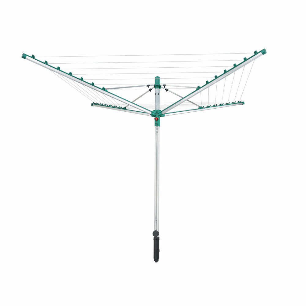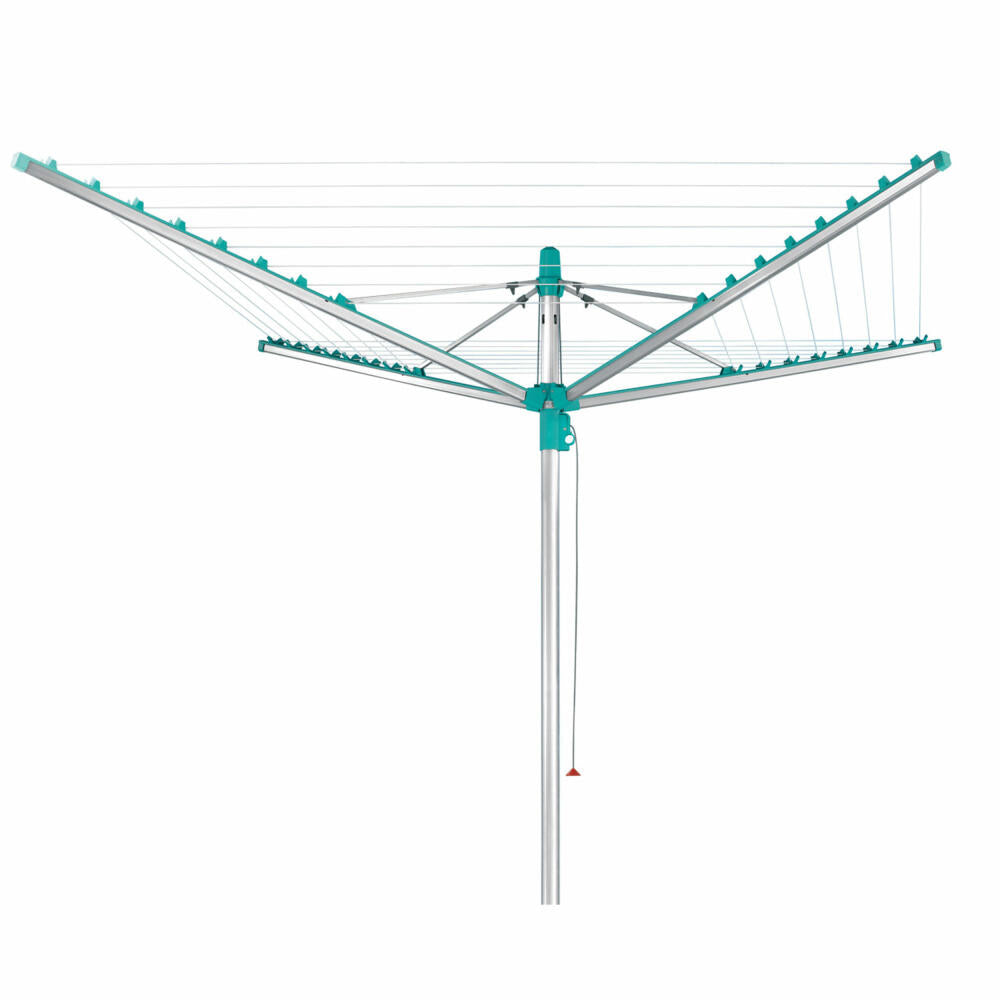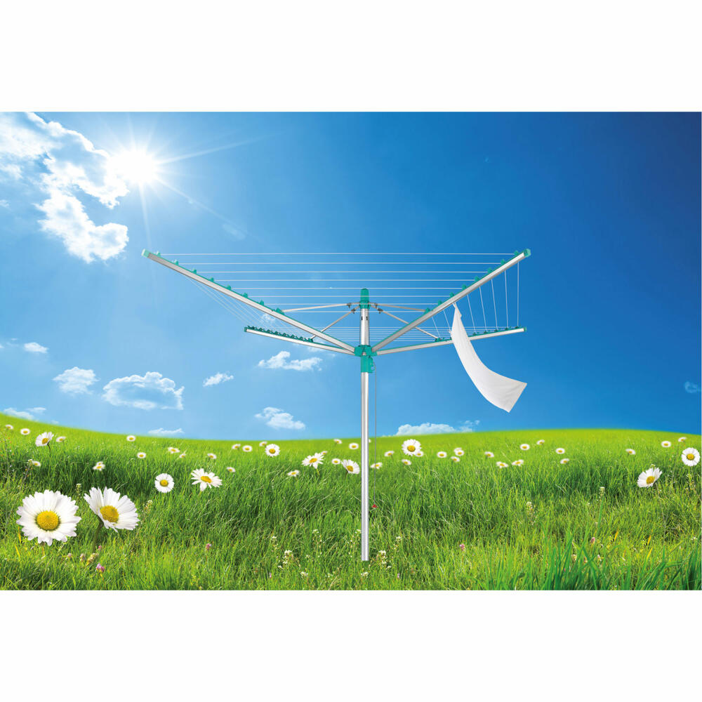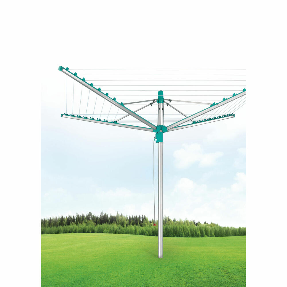 Die Linomatic V 400 bietet die millionenfach bewährte Leifheit Leinenautomatik in leichtem, offenem Design. Wie bei allen Linomatic Wäscheschirmen liegen die Leinen schmutzgeschützt in den Tragarmen. Beim Zusammenklappen der Linomatic werden sie eingezogen, beim nächsten Gebrauch spannen sie sich automatisch wieder auf. So bleiben sie trocken und sind jederzeit sauber. Weiterer Vorteil: Die Wäsche trocknet schonend und natürlich im Wind und verursacht keinen Cent Stromkosten. Kinderleicht öffnen und schließen lässt sich die Linomatic V 400 dank des Easy-Lift-Systems, mit dem sich bis zu 40% Kraft sparen lässt. Einfach an der Zugschnur ziehen und schon spannen sich die Leinen auf. Und das immer und immer wieder. Auf Grund kleiner Rasteinheiten bleiben die Leinen auch nach jahrelangem Gebrauch noch straff gespannt. Die Linomatic V 400 bietet 40 Meter Leinenlänge, so dass die Wäsche von bis zu vier Waschmaschinenfüllungen gleichzeitig trocknen kann. Bei einer maximalen Leinenlänge von 1,86 Metern findet die Linomatic V 400 selbst in kleinen Gärten oder auf einer geräumigen Terrasse Platz, ist aber groß genug für Wäschestücke wie Betttücher, Tischdecken und Badehandtücher. Alle eingesetzten Materialien sind witterungs- und UV-beständig. Inklusive Bodenhülse zum Einbetonieren sowie einem 15er Set Wäscheklammern. Als Zubehör erhältlich sind Bodendübel zum Eindrehen.