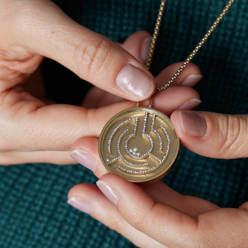 • Spielerische Eleganz: Der große, runde Anhänger dieser Kette enthält ein Geschicklichkeitsspiel, bei dem fünf Perlen durch ein Labyrinth geführt werden, während Zirkonia-Steine für funkelnde Details sorgen
