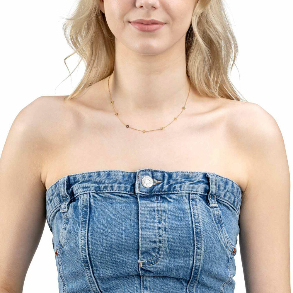 Die elegante, kurze Halskette ist ein ideales Accessoire für moderne Stacking-Looks, kann jedoch auch als Einzelstück überzeugen. Die filigrane Spiegel-Ankerkette aus Golden ionenplattiertem Edelstahl ist mit charmanten Kleeblatt-Ornamenten verziert, die einen verspielten Akzent setzen. Dank der Verlängerungskette lässt sich die Länge ganz individuell anpassen.