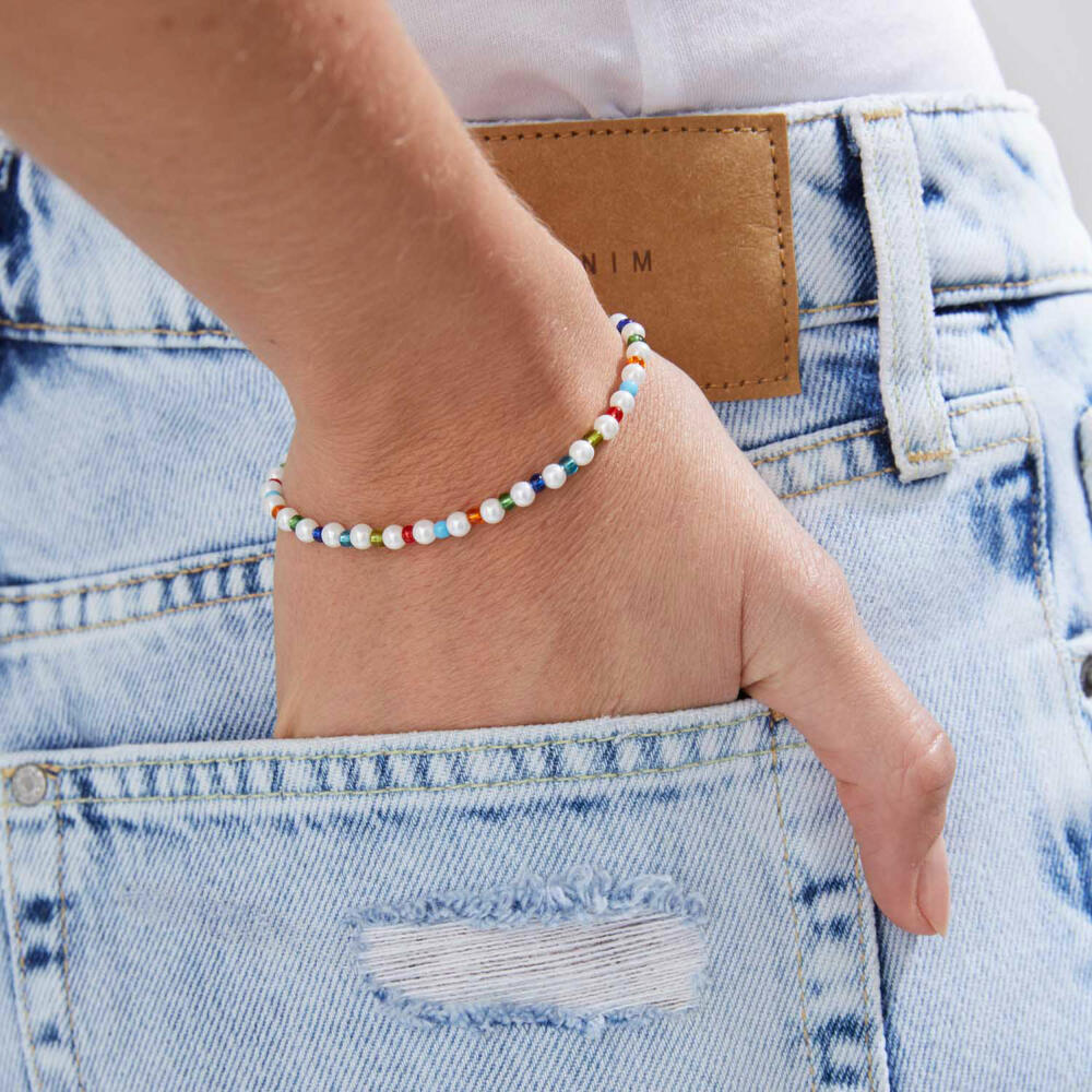 Kreativität gefragt: mit diesem Collier in mittlerer Länge bleibt es spannend. Zusammengeclippt aus einer kurzen Kette mit abgerundeten Edelstahlwürfeln und einem Armband mit Imitationsperlen und fröhlich bunten, kleinen Glas-Rocailles-Perlen und einem flächigen, runden Anhänger können je nach Lust und Laune 5 verschiedene Trage-Möglichkeiten entstehen.
