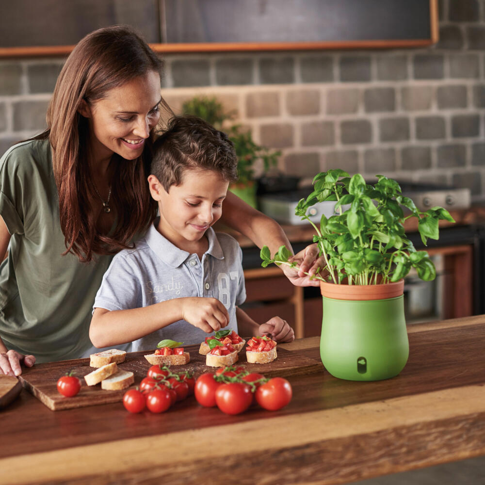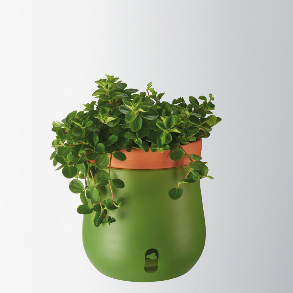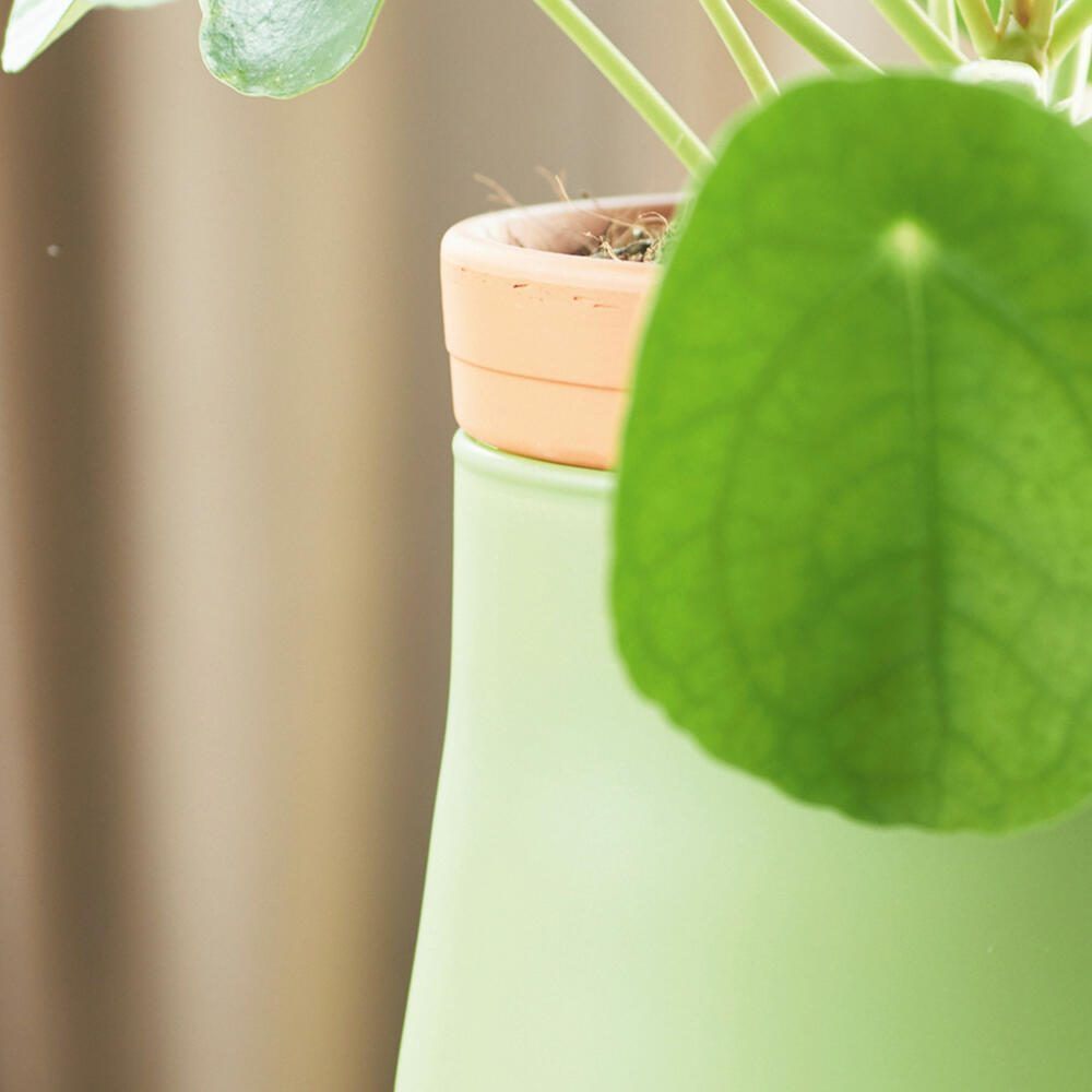 Der zweiteilige Pflanztopf aus der Reihe Serra kombiniert modernes Design mit alltagstauglicher Innovation. Der Terracottaübertopf und der aus hochwertigem Glas bestehende Topf sorgen dafür, dass Grünpflanzen stets mit der optimalen Menge an Wasser versorgt werden. Das matte Finish des Kräutertopfes lässt sich leicht mit Kreide beschriften. So lassen sich verschiedene Pflanzen gut organisieren.