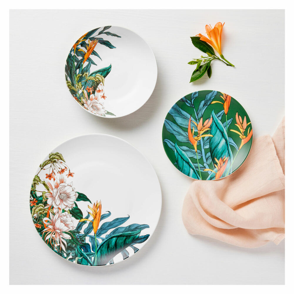 Üppige Blätter überziehen dieses zwölfteilige Dinner-Set der floralen Kollektion Night Garden und beweisen: Nicht nur bei Tageslicht offenbart die Natur ihren prächtigen Charme, sondern auch des Nachts. Was für ein schönes Ensemble aus hochwertigem Porzellan - ideal und als Set besonders praktisch, um für ein Dinner mit Freunden oder für ein Menü im Kreise der Familie stilvoll aufzutischen. Traumhaft präsentiert sich das Dinner-Set in orange-grüner Farb-Atmosphäre, kombiniert mit dem Dekor Blumen aus derselben Kollektion zaubert er übrigens Ihr ganz persönliches Gartenparadies auf die Tafel.