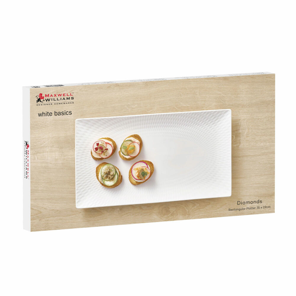 Sie haben die Qual der Wahl: Die mittlere rechteckige Platte können Sie ganz klassisch als Servierplatte oder aber auch als extravaganten Speiseteller nutzen. Besonders italienische Antipasti, Salate jeder Art oder andere Vorspeisen lassen sich wunderbar in Szene setzen. Das elegante Reliefdekor der ganz in weiß gehaltenen Serie Diamonds Round aus dem Hause Maxwell & Williams versprüht in gewohnter Manier seinen hinreißenden Charme und komplettiert die beliebte Kollektion, da bleiben keine Wünsche mehr offen.