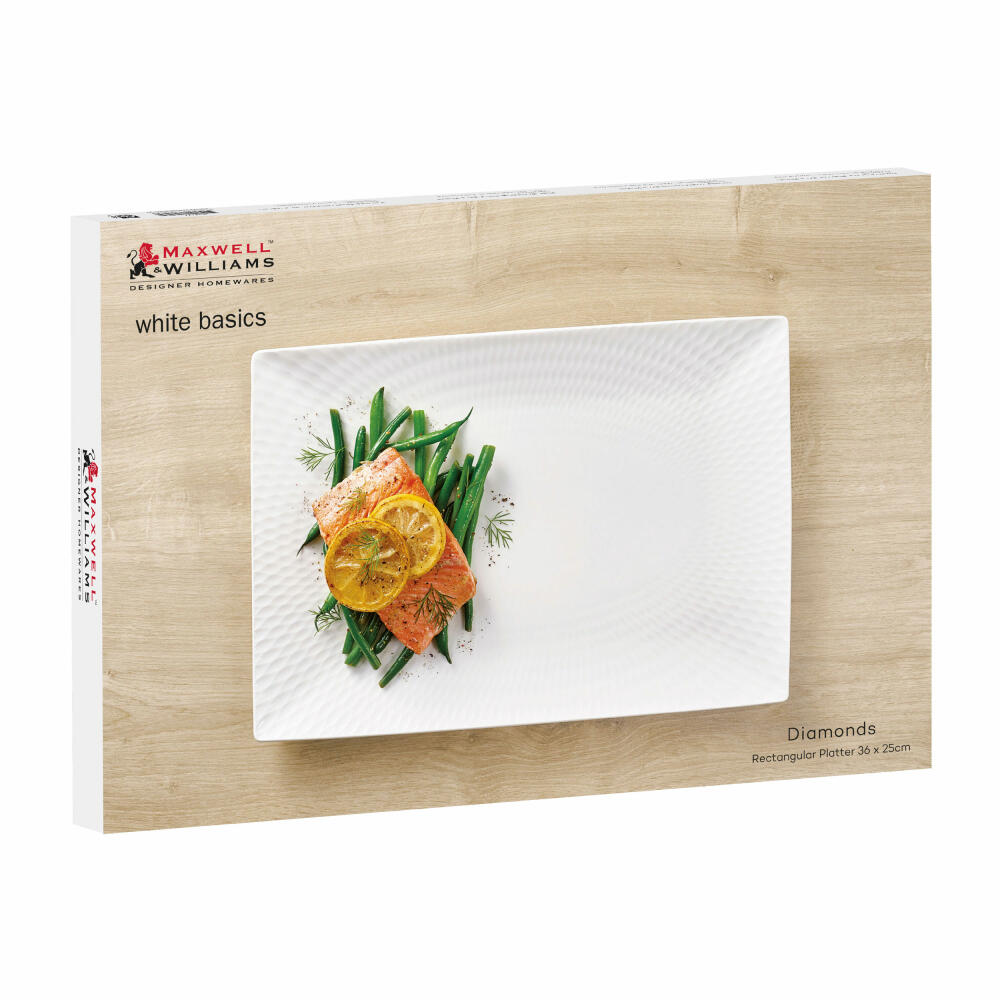 Sie haben die Qual der Wahl: Die große rechteckige Platte können Sie ganz klassisch als Servierplatte oder aber auch als extravaganten Speiseteller nutzen. Besonders italienische Antipasti, Salate jeder Art oder andere Vorspeisen lassen sich wunderbar in Szene setzen. Das elegante Reliefdekor der ganz in weiß gehaltenen Serie Diamonds Round aus dem Hause Maxwell & Williams versprüht in gewohnter Manier seinen hinreißenden Charme und komplettiert die beliebte Kollektion, da bleiben keine Wünsche mehr offen.