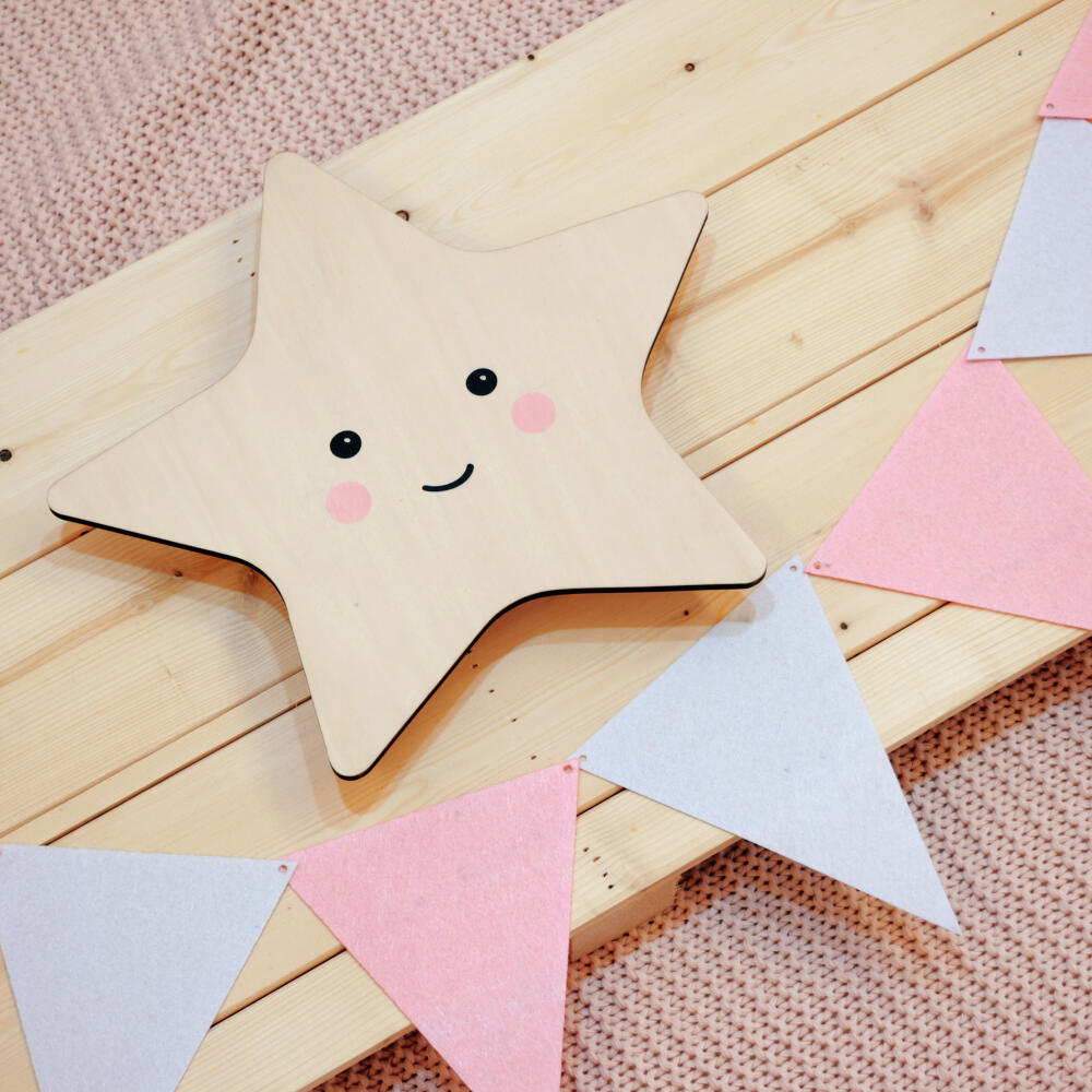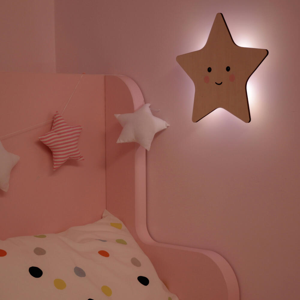 Die liebevoll gestaltete Wandleuchte taucht mit ihrem warmen, indirekten Licht das Kinderzimmer in eine schlaffördernde Wohlfühlatmosphäre. Die Leuchtdekoration in Stern-Form schafft für die Kleinen eine kleine Lichtinsel für mehr Orientierung im Dunkeln.