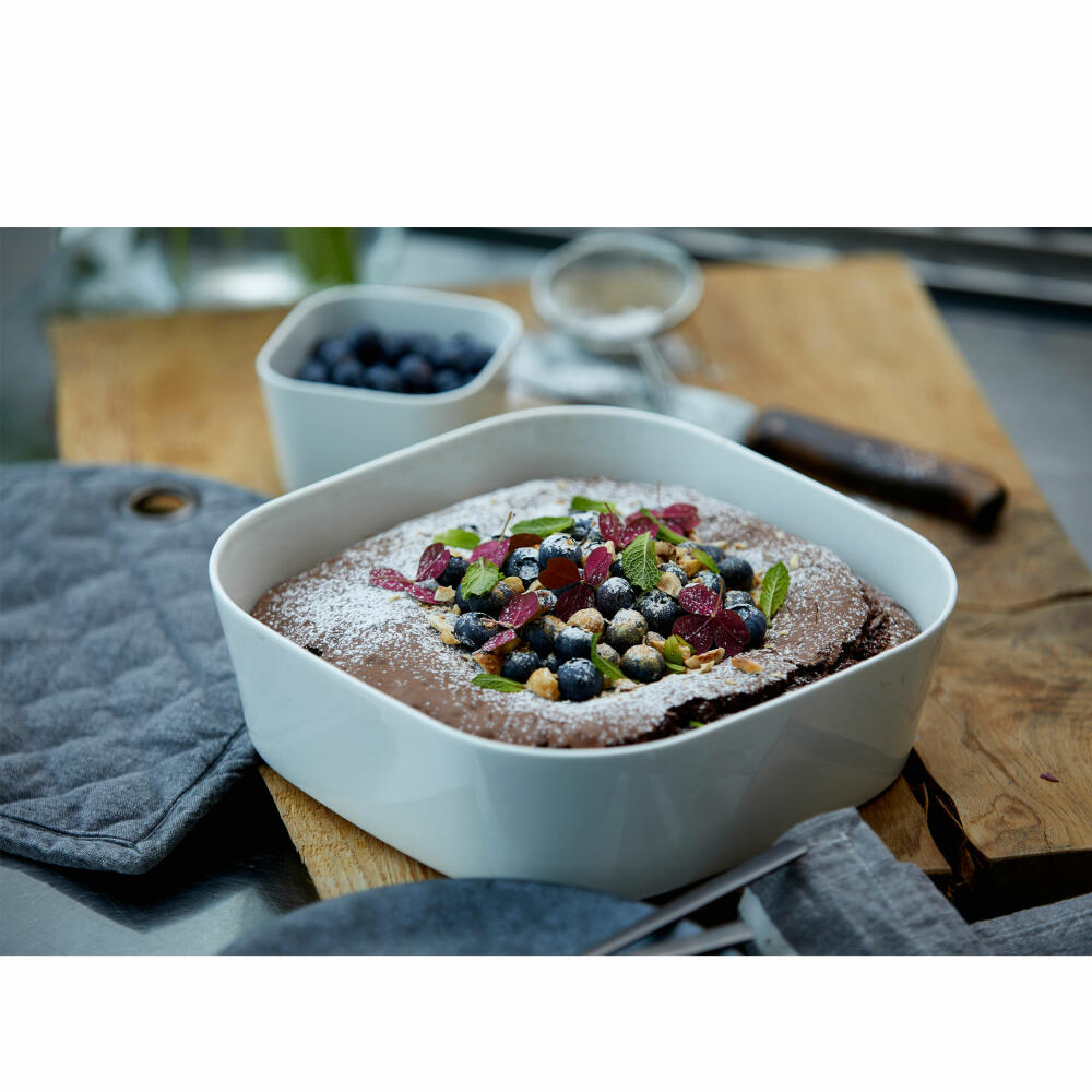 Backfeste Schale aus weißem Porzellan für die skandinavische Küche. Die Schale ist aus verstärktem Porzellan hergestellt und kann Temperaturen bis zu 350 Grad im Ofen standhalten. Der hohe Rand und die praktische Form bieten vielfältige Verwendungsmöglichkeiten. 24 x 24 x 7 cm. Geeignet für den Ofen, die Mikrowelle, den Gefrierschrank und die Spülmaschine. Unterschiedliche Größen sind ineinander stapelbar.