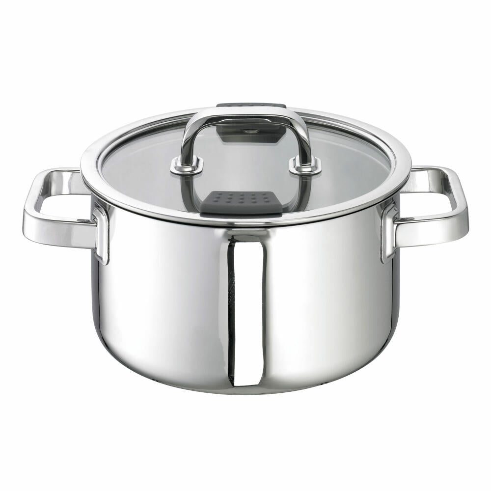• hitzebeständiger, bruchsicherer Glasdeckel mit Silikon-Grips und Abgießöffnungen in der Deckelzarge