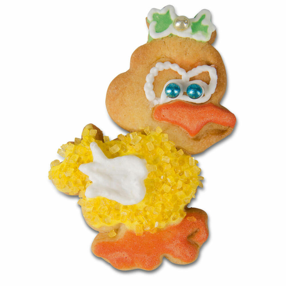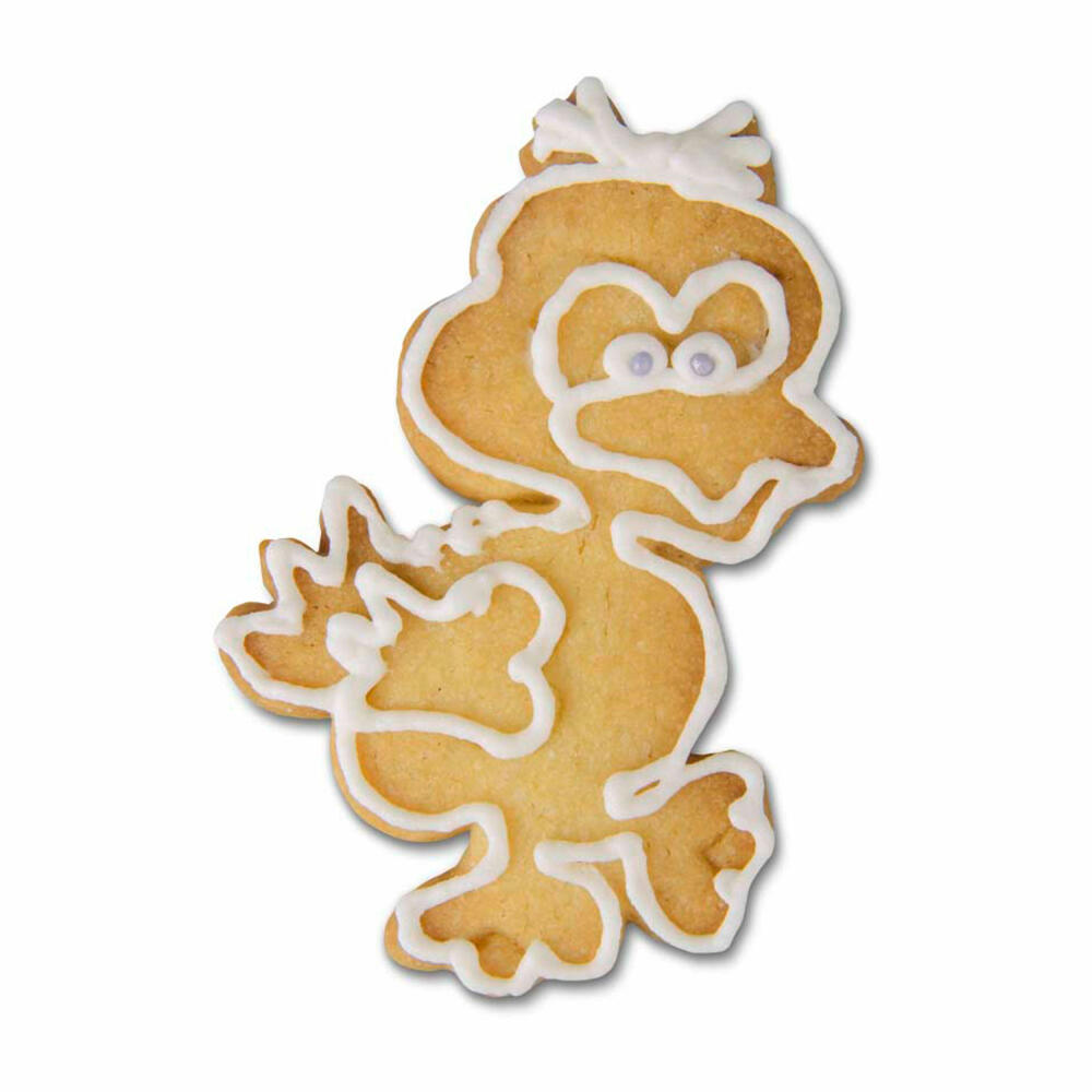 Wer quakt denn hier so schüchtern? Das Entenküken! Die kleine Ente von Städter hat eine vorgeprägte Haarschleife, Flügel, Schwänzchen, zwei Watschelfüße und natürlich einen Entenschnabel. Diese Ausstechform wurde mit viel Liebe zum Detail entwickelt. Zu den fein ausgearbeiteten Konturen kommt nun noch die Prägung auf den Plätzchen dazu, dadurch wirken sie noch viel plastischer und sind auch ohne große Verzierungen wunderschön. Oder man nutzt die Prägelinien beim Verzieren.