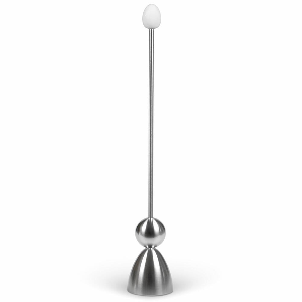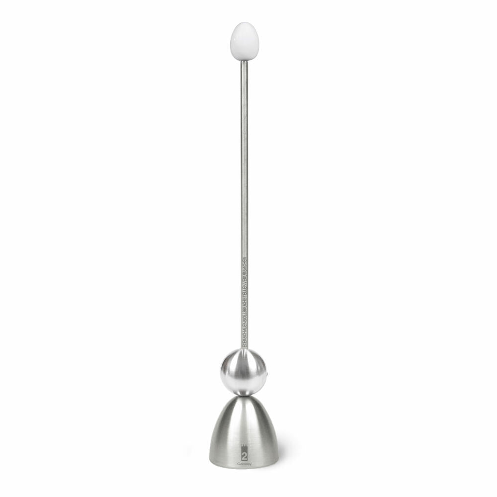 Den Eierschalensollbruchstellenverursacher bringen Sie wie folgt zum Einsatz: Metallkappe aufs gekochte Ei setzen und die Schlagkugel am Führungsstab frei fallen lassen. An der entstandenen Sollbruchstelle kann die Eikappe wahlweise durch leichtes Verkanten mit dem Clack oder mit Zuhilfenahme weiteren Bestecks vom Ei abgehoben werden.